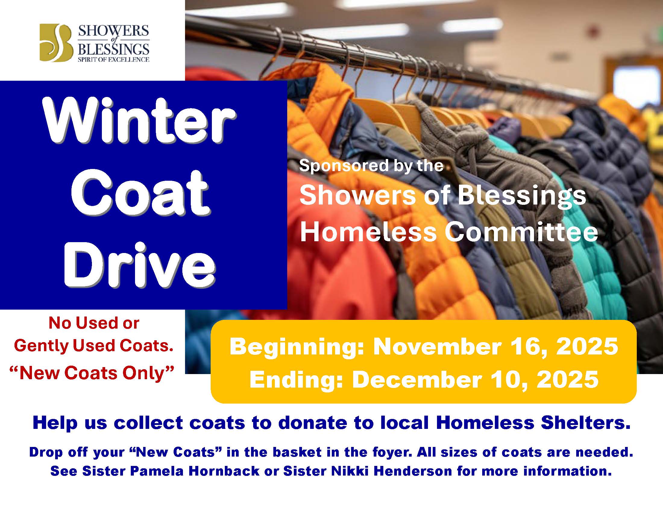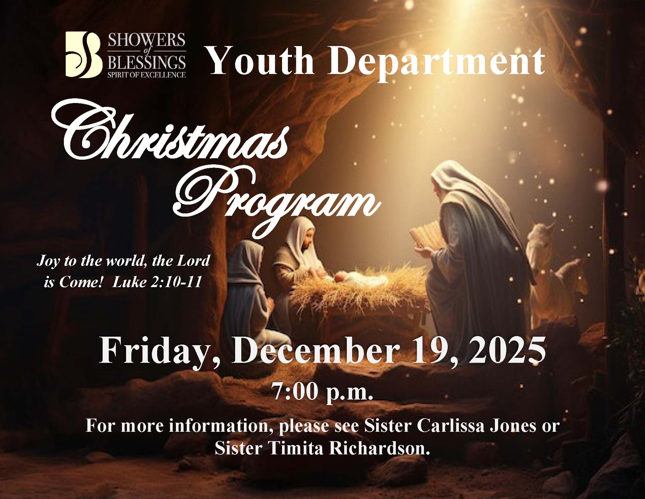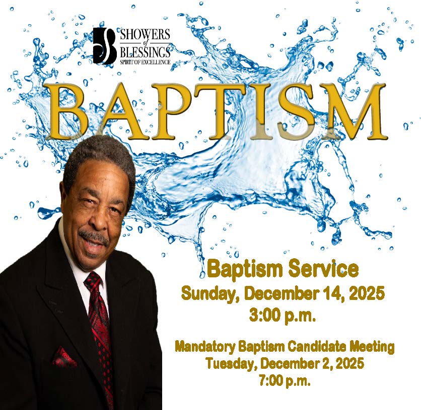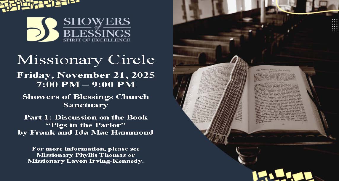 Homeless Ministry winter coat drive november 16 thru December 10, 2025 drop off coat in the basket in the foyer new coats only please VIEW FLYER Youth Ministry christmas program signups sunday, november 16, 2025 following morning serVICE first rehearsal tuesday, november 18, 2025 at 7 pm VIEW FLYER Homeless Ministry Monthly Meeting wednesday november 19, 2025 at 6 p.m. Showers of Blessings church board room VIEW FLYER Homeless Ministry Monthly Meeting wednesday november 19, 2025 at 6 p.m. Showers of Blessings church board room VIEW FLYER Widows and Widowers Ministry Monthly Meeting Thursday november 20, 2025 at 10 a.m. Showers of Blessings executive plaza cafe VIEW FLYER Missionary Circle monthly meeting friday november 21, 2025 at 7 p.m. Showers of Blessings church VIEW FLYER Altar Workers Ministry monthly meeting wednesday november 26, 2025 at 6 p.m. Showers of Blessings church board room VIEW FLYER giving thanks thanksgiving service thursday, november 27, 2025 at 8 a.m. Showers of Blessings church VIEW FLYER Usher Board monthly meeting monday, december 1, 2025 at 7:00 p.m. Showers of blessings church VIEW FLYER Baptism baptism service sunday, december 14, 2025 at 3 p.m. mandatory baptism candidate meeting tuesday, december 2, 2025 at 7 p.m. Showers of Blessings church VIEW FLYER Men’s Ministry distinctive daddies of showers monthly meeting december 1, 2025 7:00 p.m. zoom meeting Meeting ID: 831 9398 7939 passcode: DDOS VIEW FLYER Youth Department Beloved Daughters of God december 4, 2025, 6:00 p.m. Showers of Blessings Executive Plaza VIEW FLYER Men’s Ministry men’s encouragement committee breakfast fellowship December 6, 2025 8:00 a.m. Golden corral restaurant 7700 West Stockton Blvd, sacramento VIEW FLYER Youth Ministry power builder workshop Boys Age 5-15 saturday, December 6, 2025 11:00 a.m. the home depot 4641 florin road VIEW FLYER Deacon and Deaconess Board Christmas fellowship december 13, 2025 at 11:00 a.m. Showers of blessings executive plaza VIEW FLYER Greeter’s Ministry Arts and Crafts, Greeters, Usher board chriSTMAS fellowship december 13, 2025 at 10:00 a.m. Showers of blessings executive Plaza VIEW FLYER SWAT Monthly Meeting monday, December 15, 2025 at 7 p.m. Showers of Blessings executive plaza Suite 340 VIEW FLYER All Members Welcome Annual business meeting december 17, 2025 at 7:00 p.m. Showers of blessings church VIEW FLYER Youth Ministry Annual chrisTMAS program december 19, 2025 at 7 p.m. Showers of blessings church VIEW FLYER Widows and Widowers Ministry Annual chrisTMAS gala december 20, 2025 at 4 p.m. Showers of blessings executive Plaza VIEW FLYER Christian Education Department the book of john: Part 2 Tuesdays at 6:30 p.m. zoom Meeting ID: 821 2294 7971 Passcode: ced VIEW FLYER Media Ministry Volunteers are needed Contact Deacon David Lane or Sister Cherisse thomasson for more information VIEW FLYER Youth Department Volunteers are needed in several ministries Contact Sister Carlissa Jones for more information VIEW FLYER Music Ministry calling all members interested in singing rehearsals thursdays at 7:00 p.m. showers of blessings church VIEW FLYER Youth Department children’s church every SunDAY OF THE MONTH at 10:00 a.m. VIEW FLYER Sunday School Department Bring your kids to sunday school youth ages 3-17 every sunday from 8:30-9:30 a.m. Showers of Blessings church VIEW FLYER Sunday School join us for Sunday School Every Sunday morning, 8:30 A.m. showers of blessings church sanctuary VIEW FLYER Youth Department boys mime team ages 5-15 tuesdays and thursdays at 6:00 p.m. showers of blessings executive plaza VIEW FLYER Youth Department youth mime ages 5-15 every monday and friday at 6 p.m. Showers of Blessings Executive Plaza VIEW FLYER Adult Mime Ministry mime of praise rehearsals tuesdays and thursdays from 6:00 – 8:00 p.m. showers of blessings executive plaza VIEW FLYER Youth Department youth and young adult choir rehearsal every first and third SaTURDAY OF THE MONTH at 10:00 A.M. showers of blessings church sanctuary VIEW FLYER Prayer join us for intercessory prayer monday evenings at 8:00 p.m. VIEW FLYER prayer MISSIONARY CIRCLE PRAYER Line Every Wednesday at 5:00 A.M. VIEW FLYER PRAYER NOON DAY PRAYER Monday-Friday at Noon in the Sanctuary VIEW FLYER